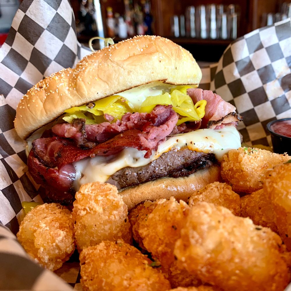 Grilled /lb Angus beef patty, thin sliced pastrami, muenster cheese, pepperoncinis and stone ground mustard aioli on a toasted kaiser bun. Comes with your choice of a side.